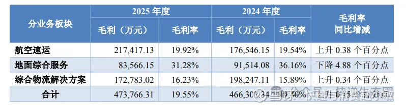 航空速运板块实现收入 109.14 亿元,同比上升 20.79%;主营业务毛利率 19.92%,同比上升0.38 个百分点。地面综合服务板块实现主营业务收入 26.71 亿元,同比上升 5.55%;主营业务毛利率 31.28%,同比下降4.88 个百分点。综合物流解决方案板块实现主营业务收入 106.48 亿元,同比下降14.65%;主营业务毛利率为 16.23%,同比增加 0.34 个百分点。