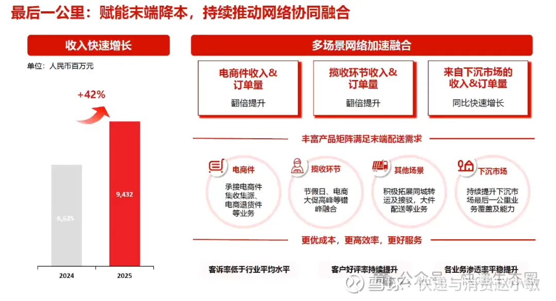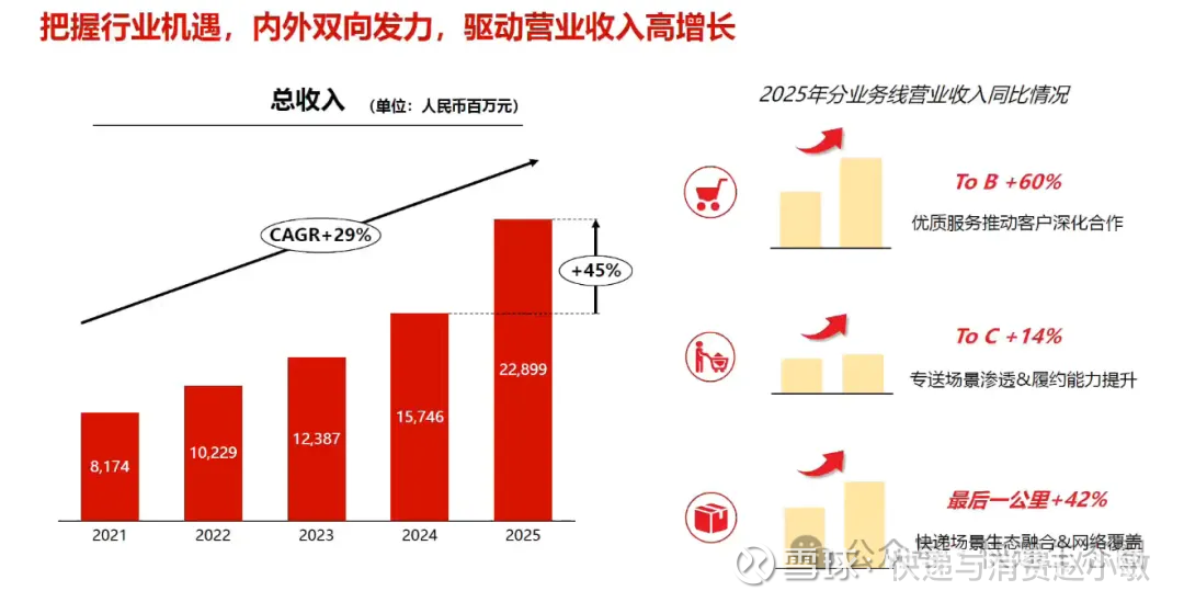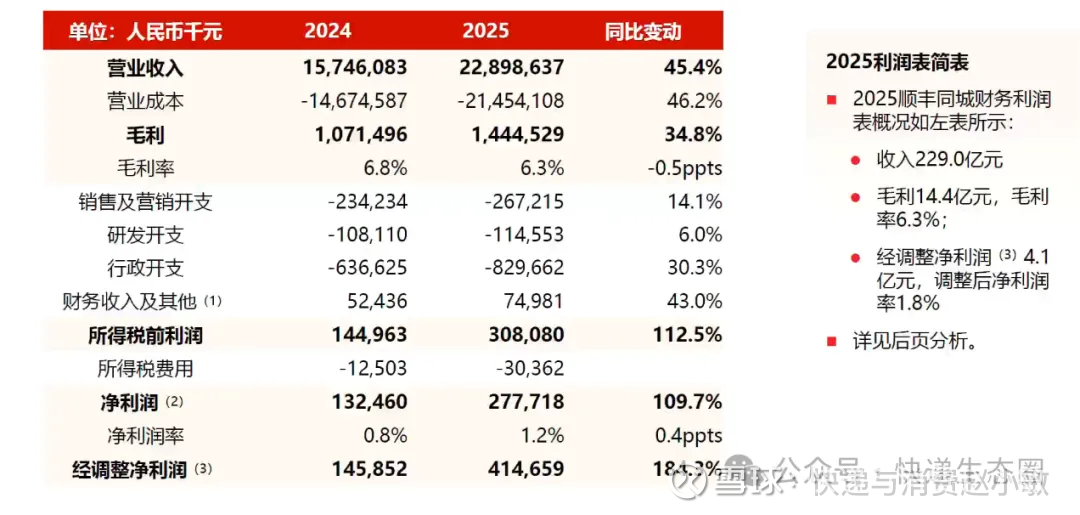 $顺丰同城(09699)$ 2025年是顺丰同城(09699.HK)的里程碑之年。收入(228.99亿元)同比劲增45.4%,远超行业增速;经调整净利润(4.15亿元)飙升184.3%,净利率稳步提升。这标志着公司已彻底告别亏损焦虑,进入规模效应驱动利润释放的新阶段。作为中立配送平台,顺丰同城精准捕捉了流量去中心化趋势。充裕的现金储备(经营性现金流增45%)为其技术研发与市场扩张提供了坚实后盾。顺丰同城已证明其具备在复杂环境中保持“高增长+高盈利”的双重能力,未来溢价空间巨大。#直播快递股# #快递生态圈 # #快递消费生态圈#