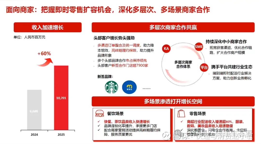 快餐、茶饮等核心餐饮品类配送收入持续快速提升,顺丰同城凭借准时率高、服务品质稳定的差异化优势,持续深化与各大头部餐饮连锁品牌的战略合作。头部客户合作收入的快速提升,一方面意味着合作深度的加深,另一方面也意味着在品牌方持续扩张门店的过程中,顺丰同城能够同步受益、持续分享增量。