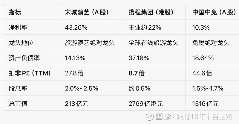 总结来看:众多景区或景点类的商业模式远不如宋城演艺,但是宋城演艺又不如中免和携程;