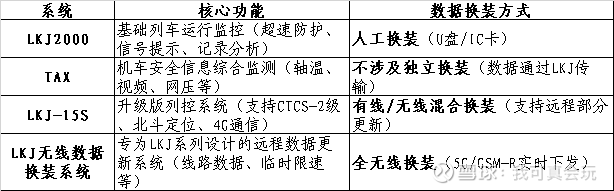以下是针对 LKJ2000、TAX、LKJ-15S 及 LKJ无线数据换装系统 的对比分析,涵盖功能定位、技术架构、数据换装方式等核心维度: