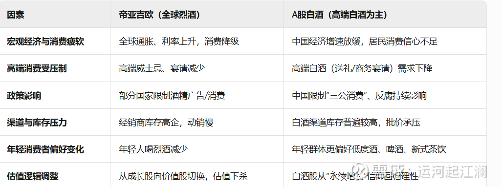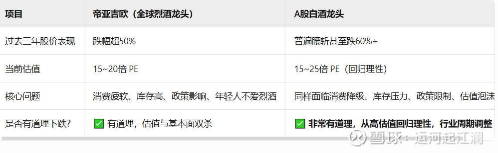 项目帝亚吉欧(全球烈酒龙头)A股白酒龙头过去三年股价表现跌幅超50%普遍腰斩甚至跌60%+当前估值15~20倍 PE15~25倍 PE(回归理性)核心问题消费疲软、库存高、政策影响、年轻人不爱烈酒同样面临消费降级、库存压力、政策限制、估值泡沫破裂是否有道理下跌?✅ 有道理,估值与基本面双杀✅ 非常有道理,从高估值回归理性,行业周期调整