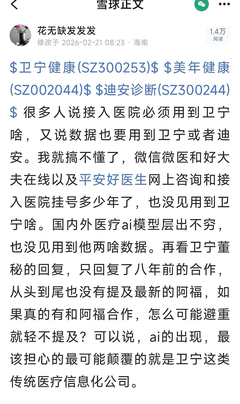 $卫宁健康(SZ300253)$ 春节前发了一篇讨论ai医疗特别是蚂蚁阿福真正受益股的帖子,明确标明个人观点:ai医疗特别是蚂蚁阿福并不会利好卫宁健康,美年健康或者什么迪安诊断。甚至觉得对他们来说还是利空。节后开盘印证了这点。事实证明,很多ai大模型搜索出来的特别是股市的所谓利好股,都是鱼龙混杂良莠不齐,里面可能有正确的信息,但更多的可能是垃圾有毒信息,需要自己动脑子,仔细甄别逻辑真假。