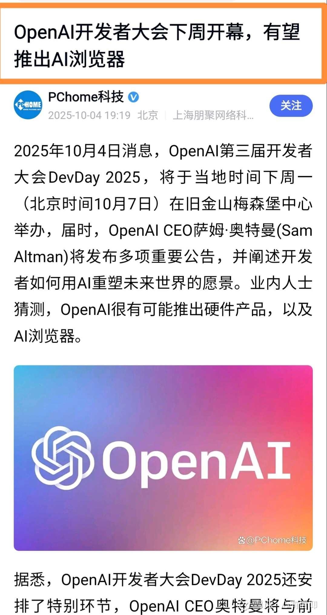 2025年10月4日消息,OpenAI第三届开发者大会DevDay 2025,将于当地时间下周一(北京时间10月7日)在旧金山梅森堡中心举办,届时,OpenAI CEO萨姆·奥特曼(Sam Altman)将发布多项重要公告,并阐述开发者如何用AI重塑未来世界的愿景。【业内人士猜测,OpenAI很有可能推出硬件产品,以及AI浏览器】。