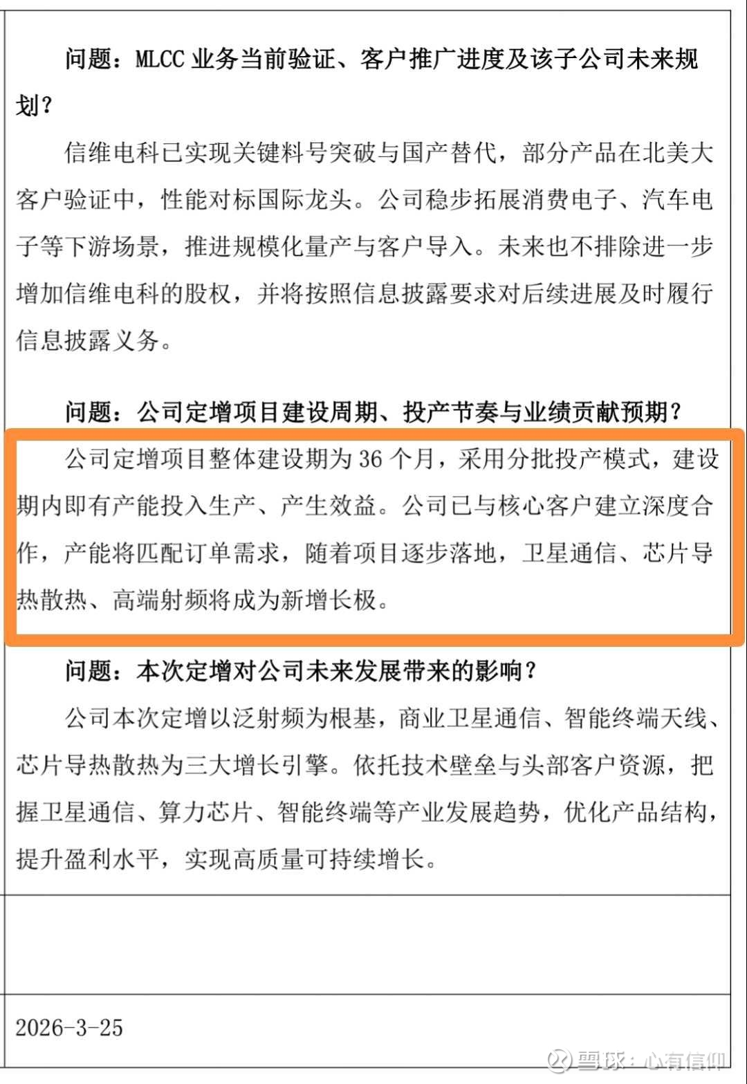 通过【信维通信】今晚的披露,可以看到的是:定增为了突破产能瓶颈、是因为订单需求确定、并且效益落地将很快、三大增长引擎清晰!