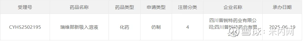 6月19日,CDE官网显示,四川普锐特药业的瑞维那新吸入溶液以仿制4类报产在审,该产品用于慢性阻塞性肺病(COPD)的维持治疗。在此之前,广州南新制药的盐酸左沙丁胺醇雾化吸入溶液以仿制3类报产在审。