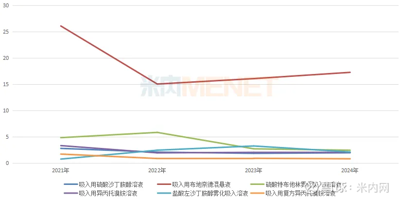 目前,吸入剂已有6个产品被纳入集采,除了吸入用复方异丙托溴铵溶液外,其余5个均在吸入剂产品TOP20之列。其中,吸入用布地奈德混悬液在中国公立医疗机构终端吸入剂产品中连续多年稳居“销冠”宝座,2021年销售规模超过60亿元,2022年受集采影响下跌超过50%,2023年-2024年止跌回升,分别同比增长22.61%、6.34%。在品牌TOP20中,吸入用布地奈德混悬液占据5个席位,4个国产品牌均为正增长,四川普锐特药业大涨27.08%、长风药业大涨26.86%、正大天晴药业集团大涨16.84%。