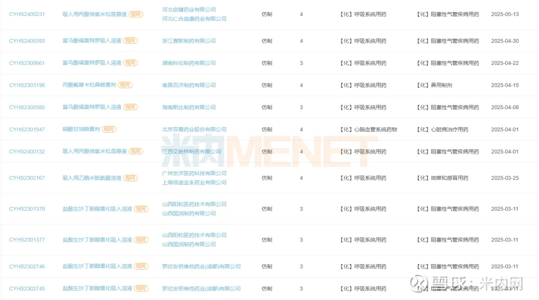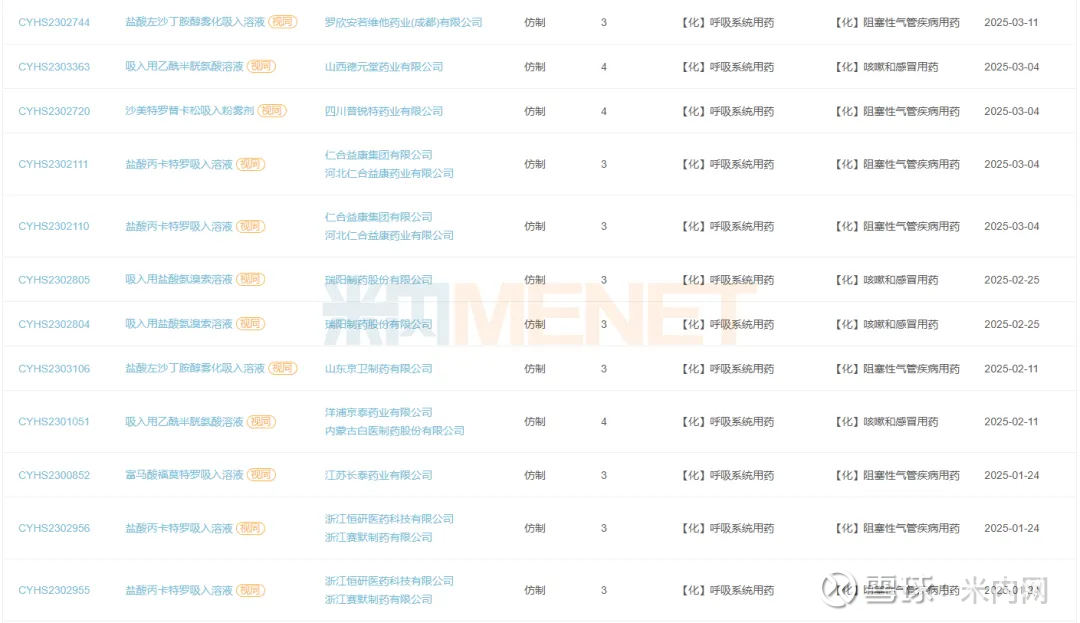 瑞维那新吸入溶液、乌美溴铵维兰特罗吸入粉雾剂、布地奈德福莫特罗吸入粉雾剂(Ⅱ)、沙美特罗替卡松吸入气雾剂、糠酸氟替卡松鼻用喷雾剂、酒石酸阿福特罗雾化吸入溶液等多个品种暂无仿制药获批,四川普锐特药业、正大天晴药业集团、上海新黄河制药、齐鲁制药、长风药业等多家企业冲刺首仿。