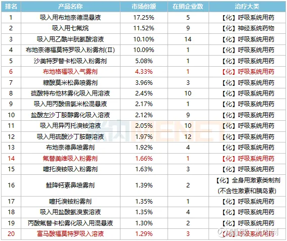 产品TOP20中,吸入用布地奈德混悬液、吸入用七氟烷、吸入用乙酰半胱氨酸溶液位居前三,富马酸福莫特罗吸入溶液凭借超过300%的强劲增速上榜,也是TOP20增速最快的产品。