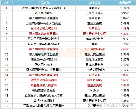 从企业品牌数量来看,阿斯利康(布地奈德福莫特罗吸入粉雾剂(Ⅱ)、吸入用布地奈德混悬液、布地格福吸入气雾剂)和葛兰素史克(沙美特罗替卡松吸入粉雾剂、氟替美维吸入粉雾剂、丙酸氟替卡松雾化吸入用混悬液)各有3个上榜,健康元(吸入用布地奈德混悬液、盐酸左沙丁胺醇雾化吸入溶液)和正大天晴药业集团(吸入用布地奈德混悬液、噻托溴铵粉雾剂)各有2个上榜。