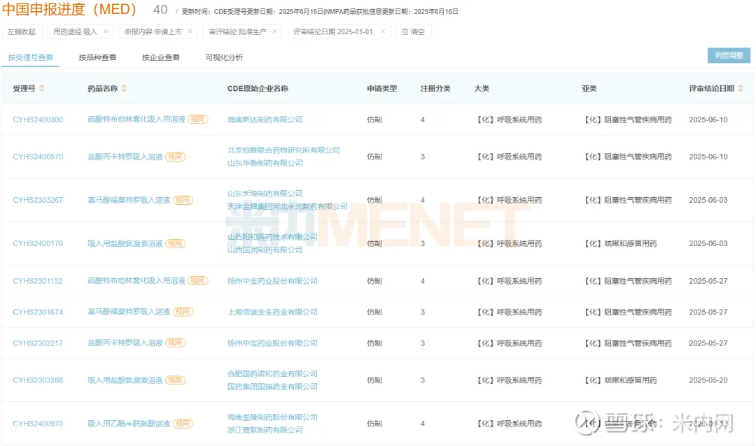 日前,海南斯达制药的硫酸特布他林雾化吸入用溶和北京柏雅联合药物研究所的盐酸丙卡特罗吸入溶液均以新分类报产同日获批。米内网数据显示,今年以来,吸入剂已有40个新产品获批上市。