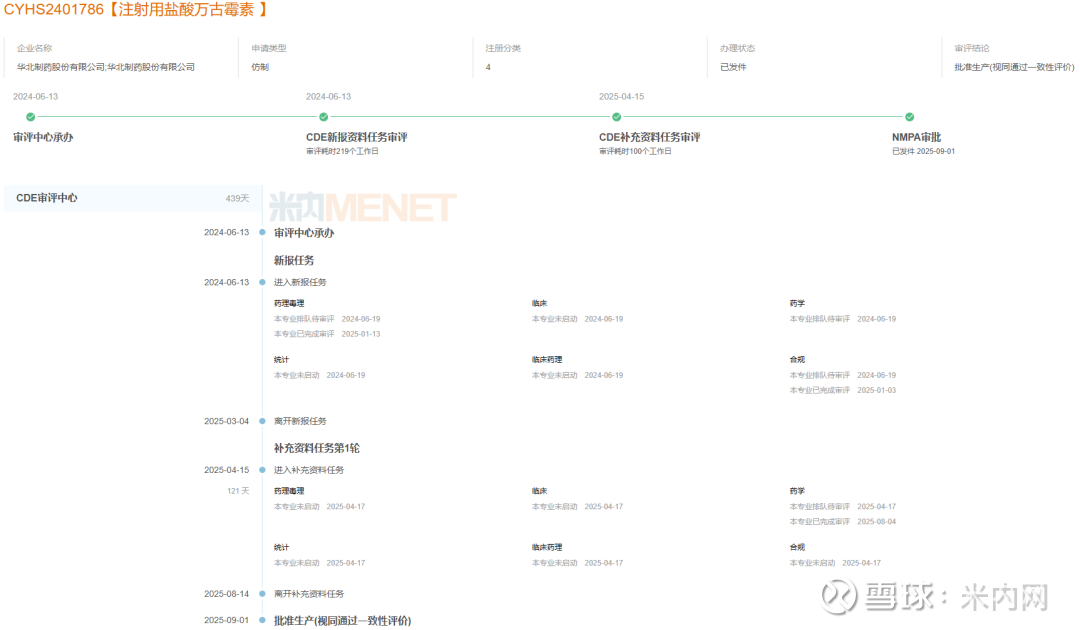 米内网数据显示,注射用盐酸万古霉素有10家企业拥有生产批文,华北制药、山东鲁抗医药等9家过评,湖北美林药业、安徽省先锋制药等4家以仿制4类报产在审,获批后视同过评。