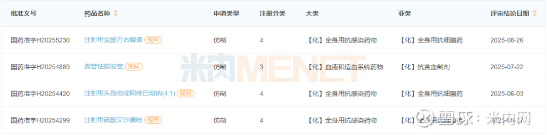 日前,国家药监局官网显示,华北制药的注射用盐酸万古霉素以仿制4类报产获批,视同过评。米内网数据显示,注射用盐酸万古霉素在2024年中国公立医疗机构终端销售额超过20亿元,2025年一季度同比增长0.62%。