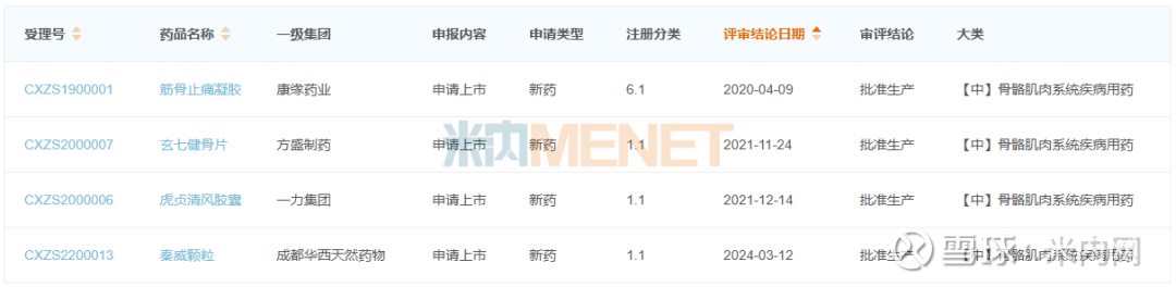 表1:报产在审的中成药骨骼肌肉系统疾病用药