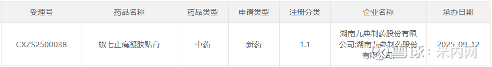 据悉,湖南九典制药的椒七止痛凝胶贴膏是基于临床经验方开发的局部经皮给药制剂,具有温经散寒、活血止痛的作用,用于寒凝血瘀所致的痹病,骨性关节炎等。湖南九典制药在9月1日发布公告,称取得了椒七止痛凝胶贴膏Ⅲ期临床试验总结报告,9月12日提交新药上市申请获得承办。