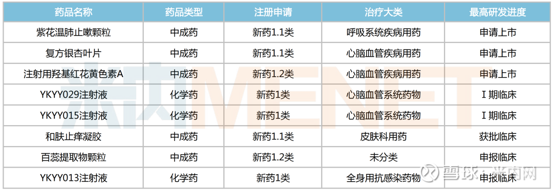 8款在研1类新药覆盖呼吸、心脑血管、皮肤、感染等疾病领域,其中,注射用羟基红花黄色素A(心脑血管疾病)、紫花温肺止嗽颗粒(感染后咳嗽)、复方银杏叶片(血管性痴呆)已报产在审,YKYY015注射液(高胆固醇血症、高血脂症)、YKYY029注射液(高血压)已步入Ⅰ期临床,和肤止痒凝胶(银屑病)已获批临床,百蕊提取物颗粒、YKYY013注射液已申报IND。