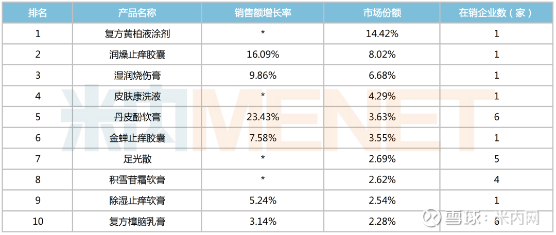 产品TOP10方面,复方黄柏液涂剂以近5亿元的销售额稳居榜首;润燥止痒胶囊、湿润烧伤膏先后位居第二和第三,销售额均超2亿元;皮肤康洗液、丹皮酚软膏、金蝉止痒胶囊分别排在第四、第五和第六,销售额均在1亿元以上。