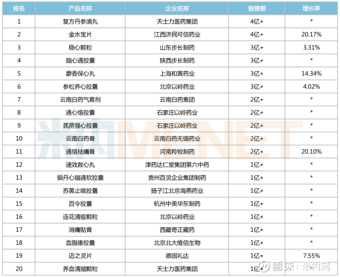 中成药TOP20品牌中,TOP6品牌销售门槛超过3亿元,涉及天士力的复方丹参滴丸、步长制药的稳心颗粒和脑心通胶囊、上海和黄药业的麝香保心丸等;9个品牌销售额呈正增长,其中羚锐制药的通络祛痛膏大涨20.1%、上海和黄药业的麝香保心丸增长14.34%。