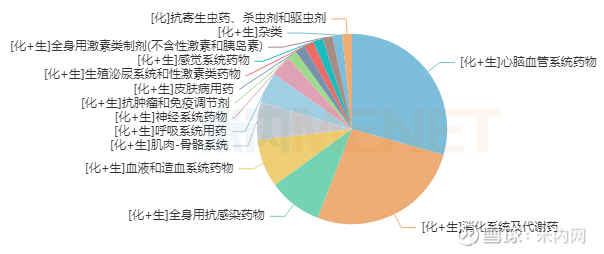 从化药及生物药大类格局上看,两个品类市场份额均达两位数,其中心脑血管系统药物占比超过30%,消化系统及代谢药占比超过28%,两者合计份额接近六成。