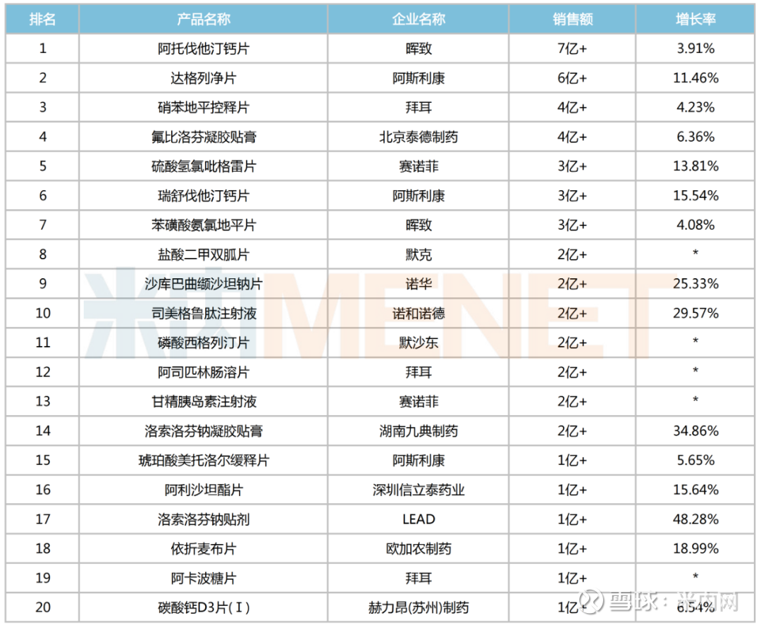17个品牌销售额实现正增长,占比达85%;其中9个涨幅达两位数,包括:LEAD的洛索洛芬钠贴剂大涨48.28%、诺和诺德的司美格鲁肽注射液大涨29.57%、诺华的沙库巴曲缬沙坦钠片大涨25.33%、信立泰的阿利沙坦酯片增长15.64%等。