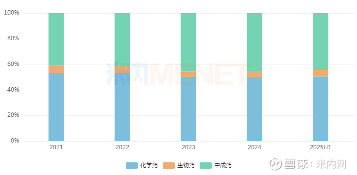 2025上半年药品类型格局方面,化药与中成药几乎“平分秋色”,市场份额分别超50%和44%;生物药仍处于低位水平,市占比约5%,这也与城市社区以针对基础疾病、慢病为主的用药结构有关。