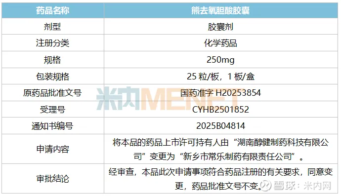 近日,江苏联环药业发布公告称,国家药监局批准了熊去氧胆酸胶囊(国药准字H20253854)的上市许可持有人由湖南醇健制药变更为控股子公司新乡常乐制药,截至目前该产品累计投入(含药品技术转让费)约1800万元。熊去氧胆酸胶囊2024年在中国三大终端六大市场的销售额超过17亿元。
