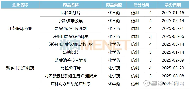 表2:今年以来江苏联环药业及新乡常乐制药申报上市的新品