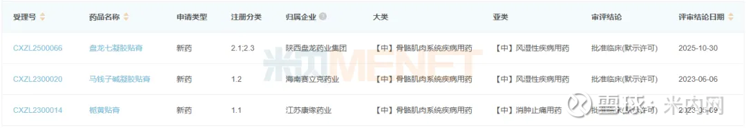 2020年至今,中成药贴膏剂有3款新药获批临床,其中,江苏康缘药业的栀黄贴膏和海南赛立克药业的马钱子碱凝胶贴膏均为中药1类新药。