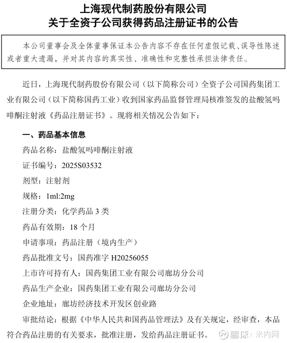 国药现代表示,此次盐酸氢吗啡酮注射液获批上市,标志着公司具备在国内市场生产销售该产品的资格,进一步丰富公司麻醉镇痛板块产品线,有利于进一步增强综合市场竞争力,为公司未来发展带来积极影响。