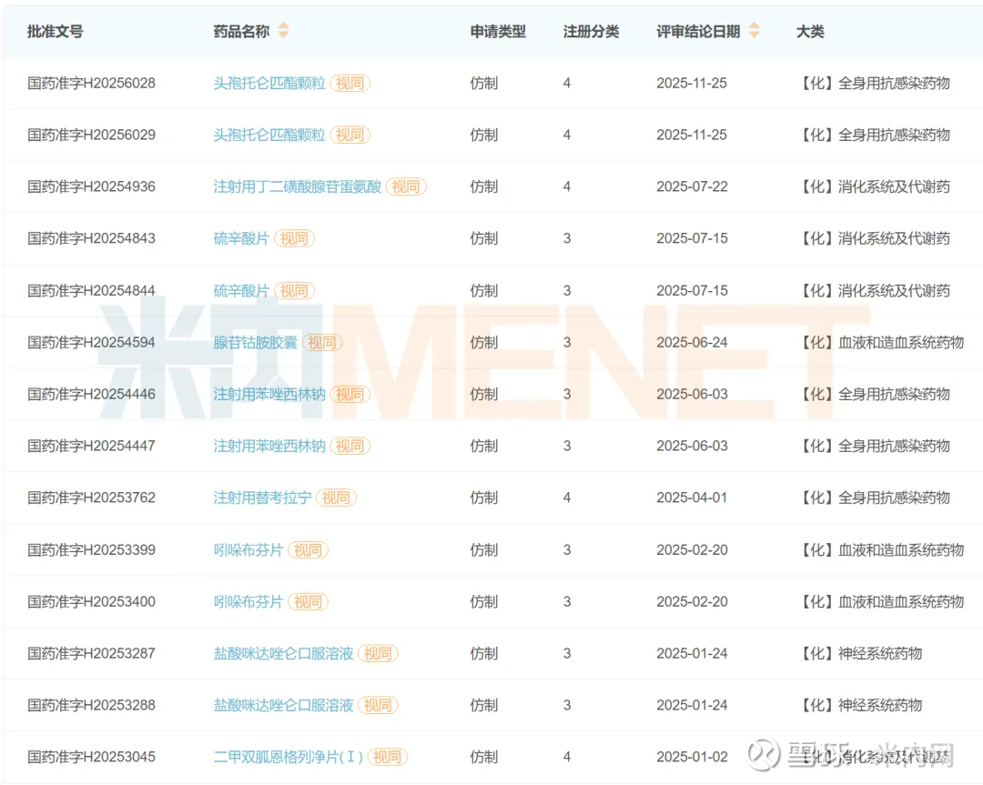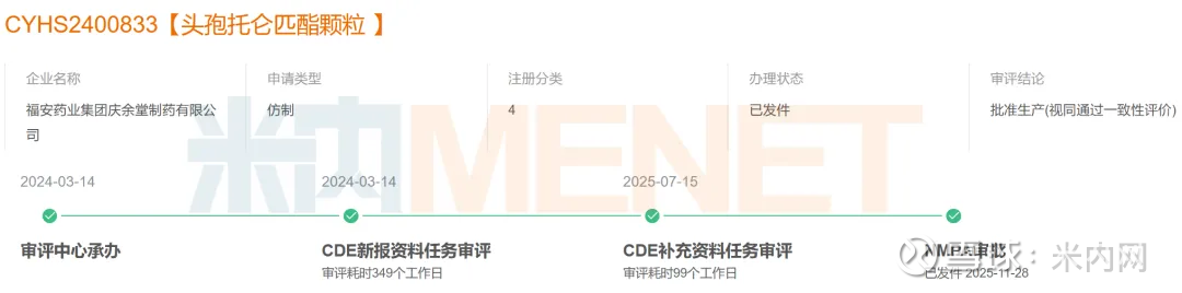 近日,福安药业庆余堂制药申报的4类仿制药头孢托仑匹酯颗粒获批生产,为国内首仿+首家过评。这是一款头孢类抗菌药,2024年在中国三大终端六大市场(统计范围详见本文末)的销售额超过2亿元。