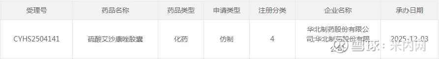 12月13日,CDE官网显示,华北制药的4类仿制药硫酸艾沙康唑胶囊报产获受理。该产品是一款广谱三唑类抗真菌药,2023-2025H1在中国三大终端六大市场销售额增速均达三位数。今年以来,华北制药已有5款产品获批上市,12款新品报产在审。