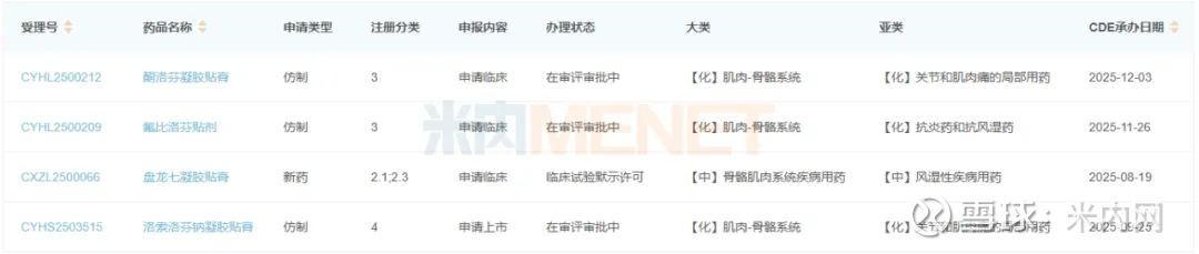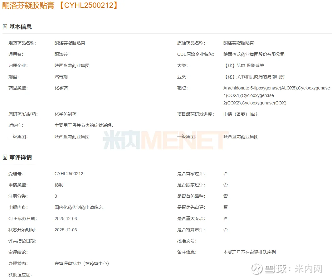 日前,CDE官网显示,陕西盘龙药业的酮洛芬凝胶贴膏以化药仿制3类申请临床获受理。米内网数据显示,酮洛芬凝胶贴膏在2025年上半年中国三大终端六大市场销售额同比增长700.11%。