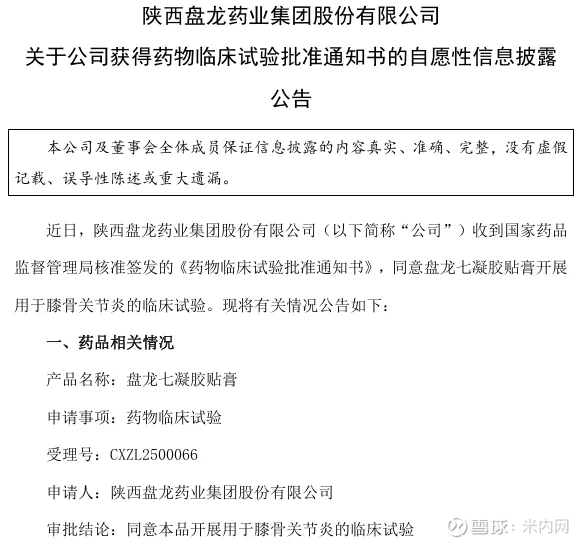在此之前,盘龙药业发布公告,公司的盘龙七凝胶贴膏获批临床。该产品是由盘龙七药酒改良而来,处方由盘龙七、壮筋丹等30味药材组成,开发成凝胶贴膏剂,该产品较原剂型在使用便捷性、起效速度、使用人群等方面均有明显优势,其主治功能为活血化瘀、祛风除湿、消肿止痛,适用于膝骨关节炎(气滞血瘀证)。