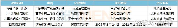 2025年,国家药监局发布多个中药保护品种公告和中药保护品种受理公示,7款儿科中成药在列,均为独家产品,其中,一品红生物医药的芩香清解口服液、鲁南厚普制药的小儿消积止咳颗粒、亚宝药业四川制药的儿童清咽解热口服液均为首家中药二级保护品种,湖南汉森制药的四磨汤口服液为延长保护期(二级保护),湖南方盛制药的小儿荆杏止咳颗粒、吉林敖东延边药业的小儿柴桂退热口服液、南京中山制药的小儿感冒舒颗粒均为申请中药品种保护初保获受理。