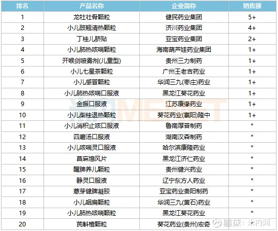 品牌TOP20中,健民药业集团的龙牡壮骨颗粒、济川药业集团的小儿豉翘清热颗粒、亚宝药业集团的丁桂儿脐贴位居前三,海南葫芦娃药业集团的小儿肺热咳喘颗粒、广州王老吉药业的小儿七星茶颗粒、江苏康缘药业的金振口服液等销售额均超过1亿元。