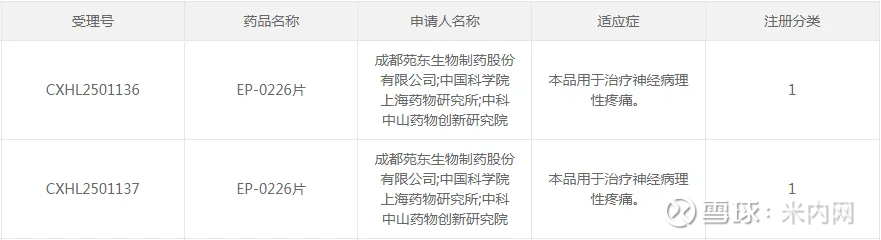 EP-0226片是由苑东生物和上海药物所、中山药创院联合开发的化药1类创新药,拟用于治疗神经病理性疼痛。米内网数据显示,该新药的临床申请(CXHL2501136/7)均于2025年10月获得承办,随后于2026年1月获得临床试验默示许可。