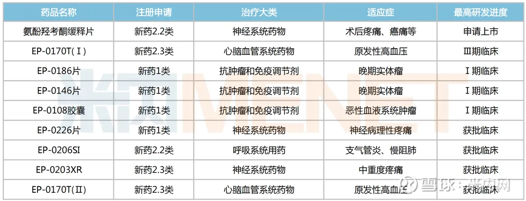 9款化药新药中,包含4款1类新药、2款2.2类新药和3款2.3类新药。从最高研发进度看,2.2类新药氨酚羟考酮缓释片(术后疼痛、癌痛等)已报产在审,米内网预测其将于今年2月传来喜讯;2.3类新药EP-0170T(Ⅰ)(原发性高血压)正处Ⅲ期临床试验阶段,申报NDA可期;1类新药EP-0186片(晚期实体瘤)、EP-0146片(晚期实体瘤)和EP-0108胶囊(恶性血液系统肿瘤)均已步入Ⅰ期临床。