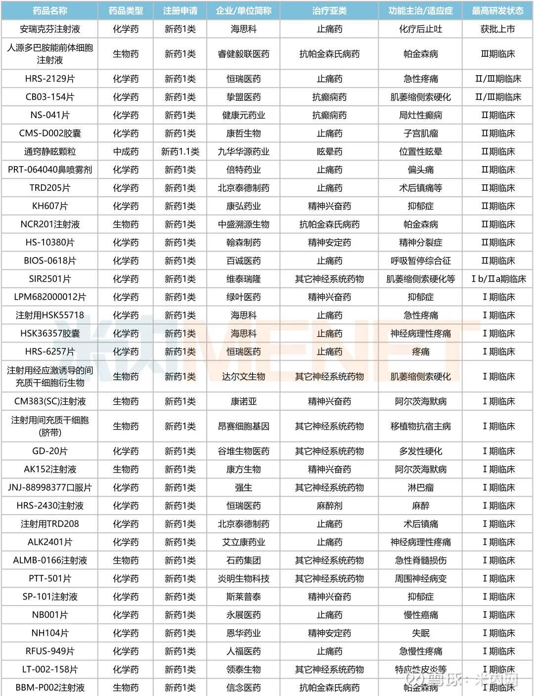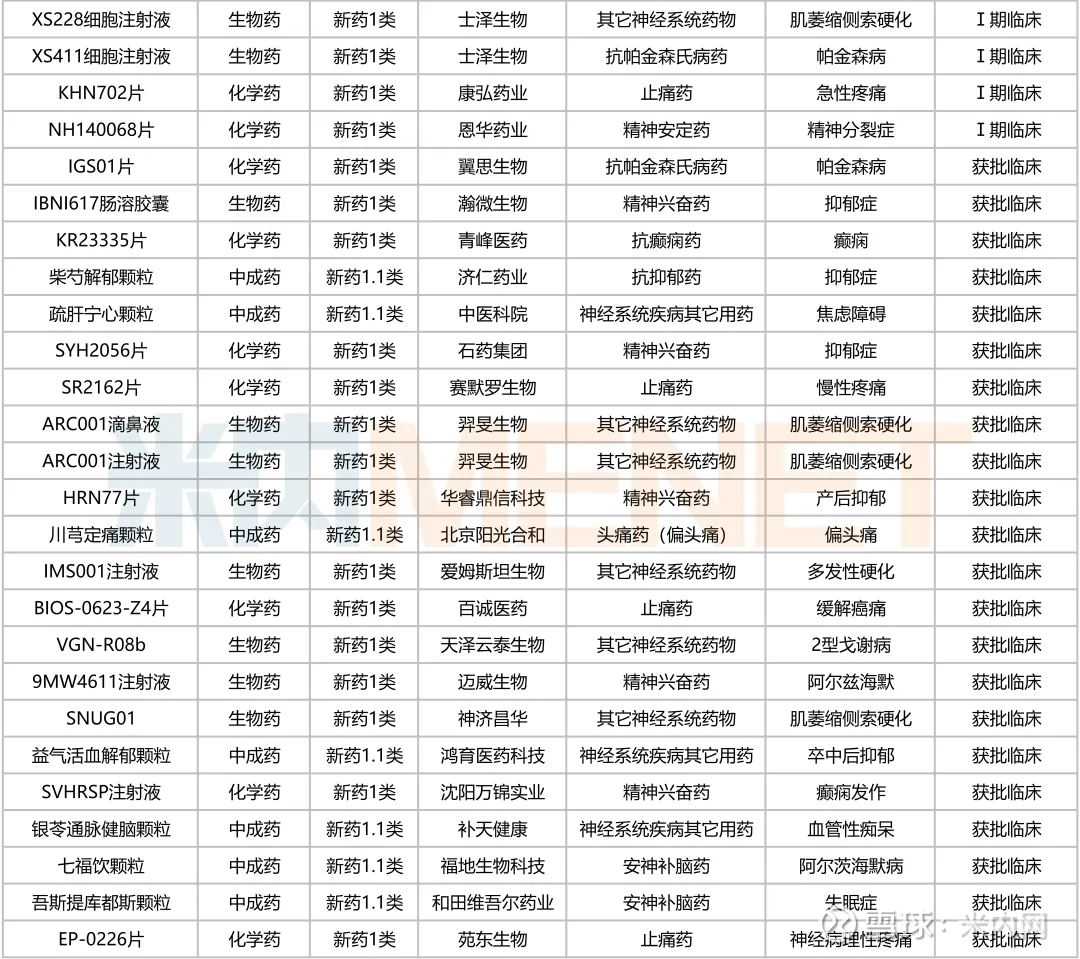 61款获批临床的新药中,睿健毅联医药的生物药1类新药人源多巴胺能前体细胞注射液正处于Ⅲ期临床阶段,恒瑞医药的化药1类新药HRS-2129片、挚盟医药的化药1类新药CB03-154片均已步入Ⅱ/Ⅲ期临床,倍特药业的化药1类新药PRT-064040鼻喷雾剂、九华华源药业的中药1.1类新药通窍静眩颗粒、北京泰德制药的化药1类新药TRD205片等9款新品均已步入Ⅱ期临床。