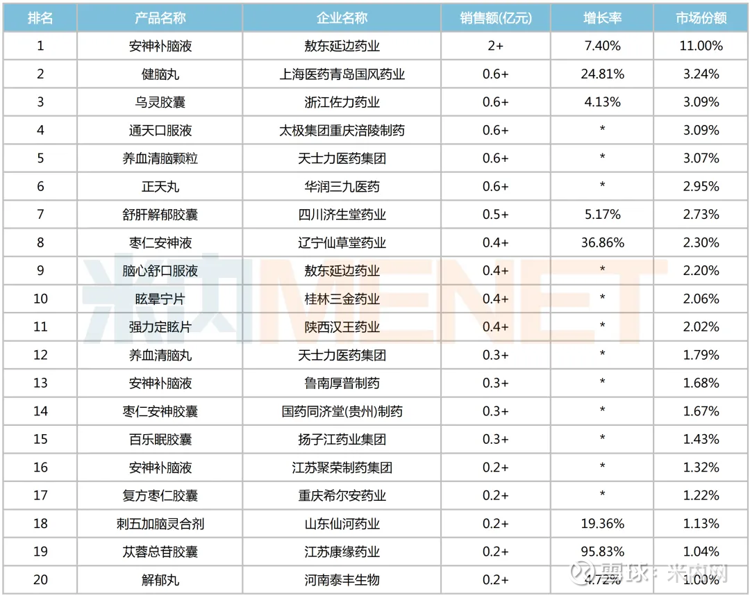 9个品牌销售额实现正增长,其中康缘药业的苁蓉总苷胶囊暴涨95.83%、辽宁仙草堂药业的枣仁安神液大涨36.86%、上海医药青岛国风药业的健脑丸大涨24.81%、山东仙河药业的刺五加脑灵合剂大涨19.36%、敖东延边药业的安神补脑液和四川济生堂药业的舒肝解郁胶囊均涨逾5%。