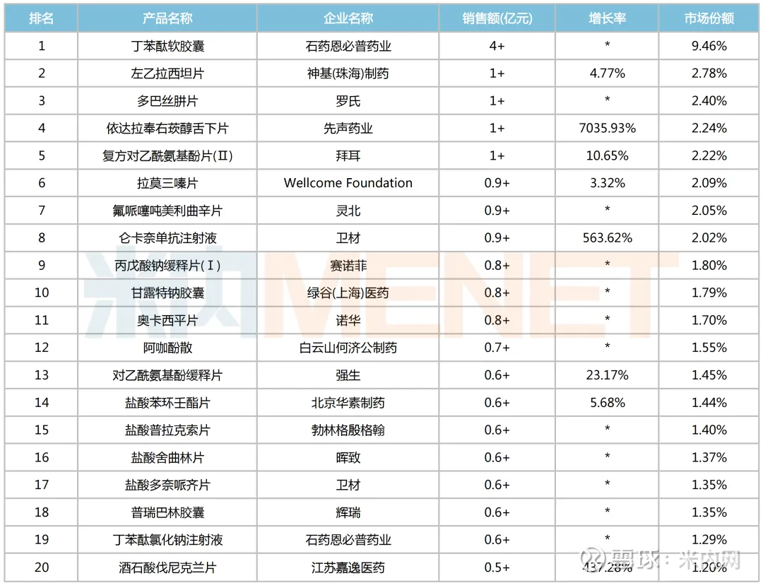 神经系统西药品牌TOP20方面,石药恩必普药业的丁苯酞软胶囊继续稳居第一,销售额超过4亿元;神基制药的左乙拉西坦片、罗氏的多巴丝肼片、先声药业的依达拉奉右莰醇舌下片、拜耳的复方对乙酰氨基酚片(Ⅱ)先后排名第二至第五,销售额均在1亿元以上。