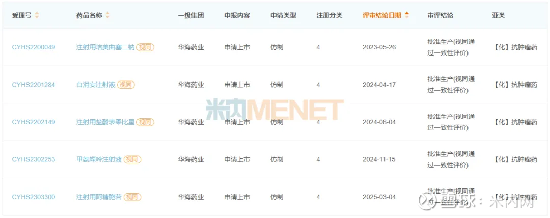 米内网数据显示,2023年5月,华海药业的注射用培美曲塞二钠获批上市,成为了公司首个上市的抗肿瘤药,截至目前公司已获批了5款抗肿瘤药,均为化药仿制药。