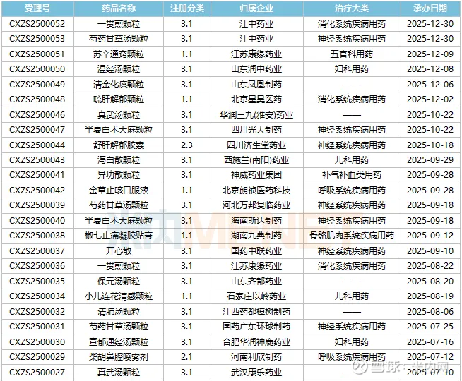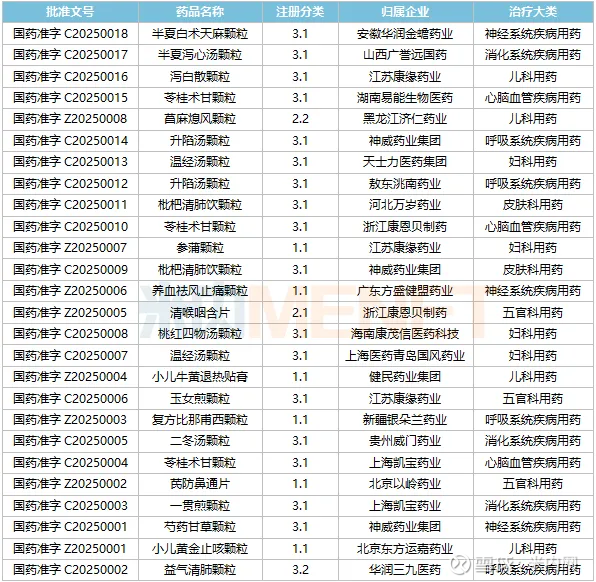 近年来,国内中药新药获批不断,2020年-2025年已有合计69款中药新药获批上市。而2025年则创下新高,上半年有神威药业集团的芍药甘草汤颗粒、上海凯宝药业的一贯煎颗粒、上海医药青岛国风药业的温经汤颗粒等14款获批上市;下半年有河北万岁药业的枇杷清肺饮颗粒、浙江康恩贝制药的苓桂术甘颗粒、山西广誉远国药的半夏泻心汤颗粒等12款获批上市。