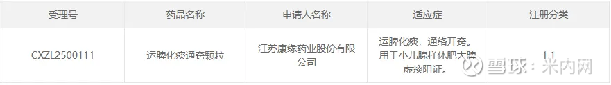 运脾化痰通窍颗粒是由康缘药业开发的中药1.1类新药,功能主治运脾化痰、通络开窍,拟用于小儿腺样体肥大脾虚痰阻证。米内网数据显示,该新药的临床申请(CXZL2500111)于2025年11月获得承办,随后于2026年1月获得临床试验默示许可。