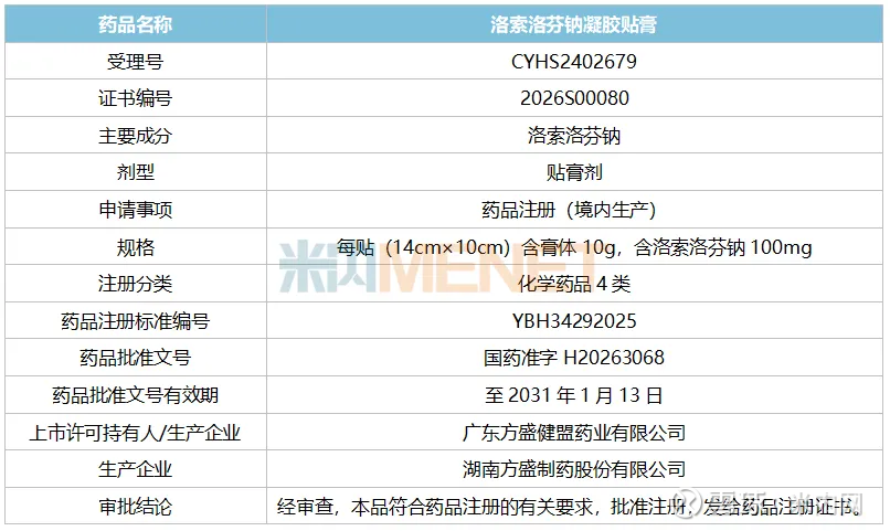 洛索洛芬钠凝胶贴膏是方盛制药2026年首个获批的新产品,目前公司还有10个高端仿制药报产在审,涉及肌肉-骨骼系统大类的是艾拉莫德片,该产品是抗炎药和抗风湿药超10亿明星药。