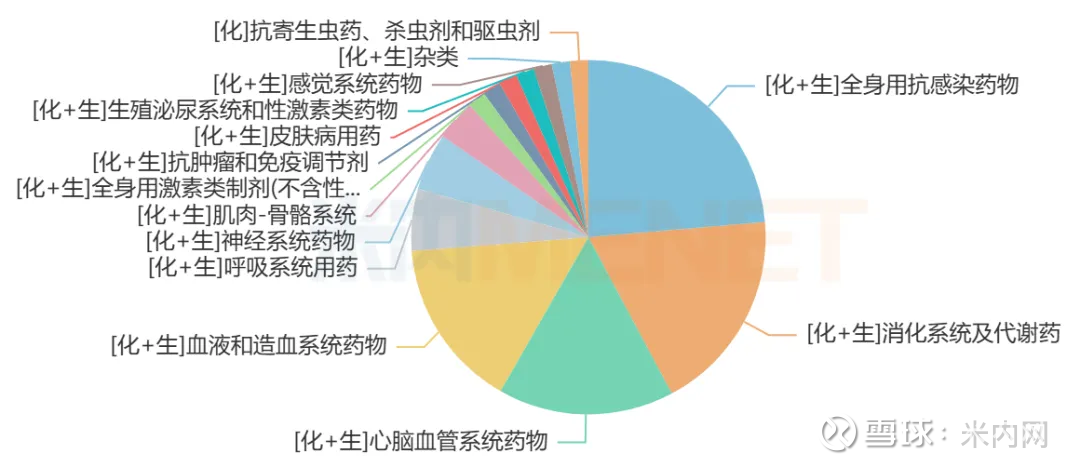 化药及生物药14个治疗大类中,有11个销售额呈下滑态势。其中,全身用抗感染药物蝉联榜首,但下滑幅度最大,且占比由2022年的超30%持续下滑至2025年前三季度的不足25%;消化系统及代谢药以超19%的占比紧接其后,依次位列第三、第四的心脑血管系统药物、血液和造血系统药物占比均超16%。