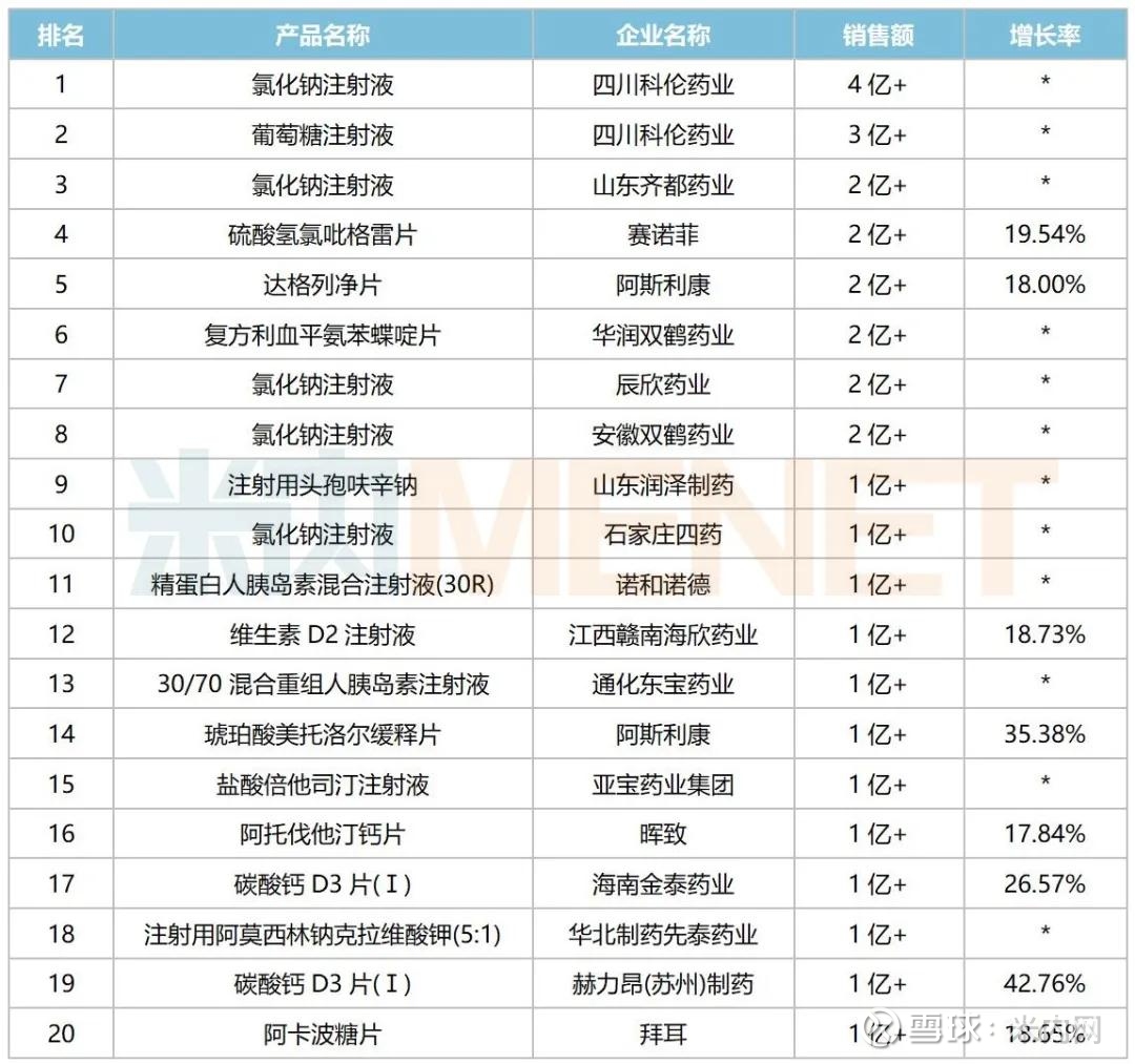 从企业情况看,科伦药业、阿斯利康、华润医药均有2个品种在列,其中阿斯利康的琥珀酸美托洛尔缓释片及达格列净片销售额增速均达两位数;此外,华北制药、亚宝药业、石家庄四药、赛诺菲、诺和诺德等企业亦有品种上榜。