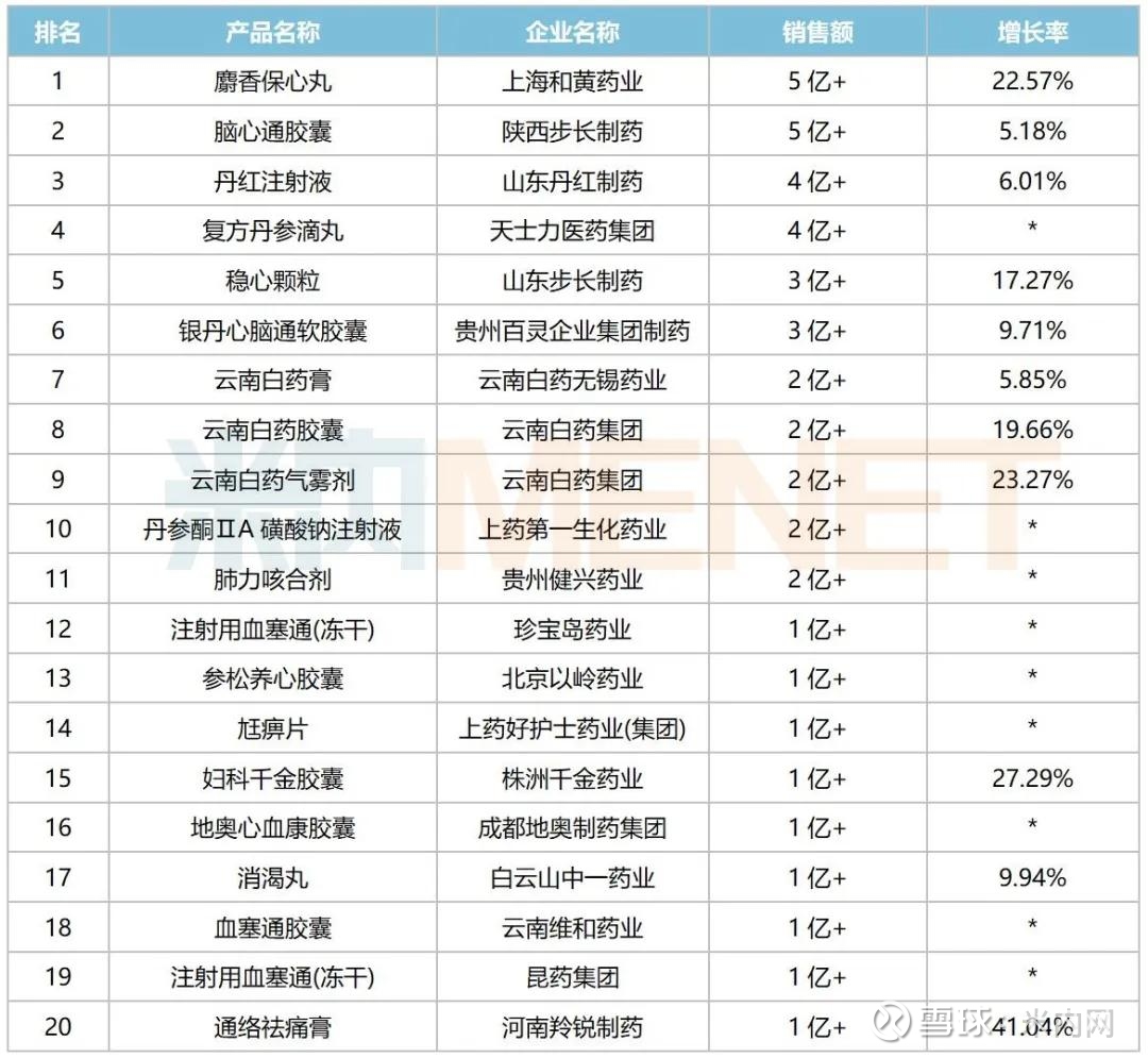 独家品种(含独家剂型)霸榜,步长制药、云南白药、上海医药均有3个独家品种在列,其中上海医药的麝香保心丸、步长制药的脑心通胶囊销售额均超过5亿元;天士力、以岭药业、千金药业、广药集团、羚锐制药等亦有独家品种上榜。