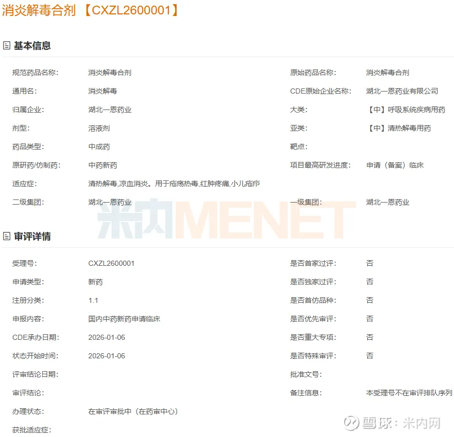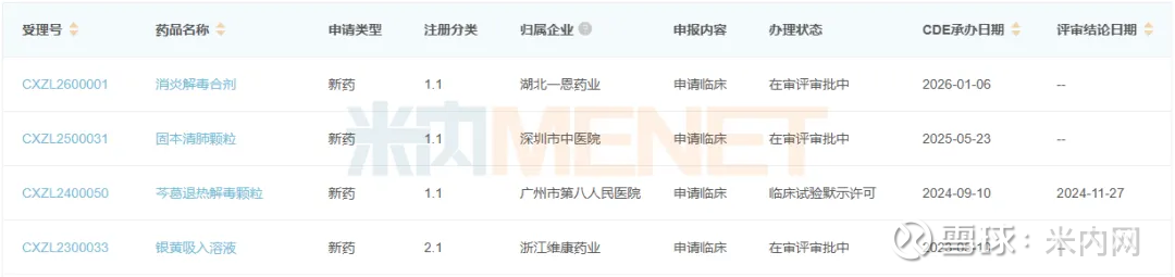 今年1月,湖北一恩药业的消炎解毒合剂申请临床获CDE受理,该产品为中药1.1类新药,有清热解毒、凉血消炎功效,用于疮疡热毒、红肿疼痛、小儿疮疖。