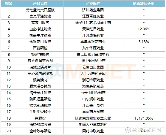 12个独家品种上榜,包括济川药业集团的蒲地蓝消炎口服液、青峰医药的喜炎平注射液、扬子江江苏龙凤堂中药的蓝芩口服液、天士力医药集团的穿心莲内酯滴丸、江西普正制药的裸花紫珠颗粒等,其中,国药中联药业的金叶败毒颗粒首次晋身TOP20品牌。