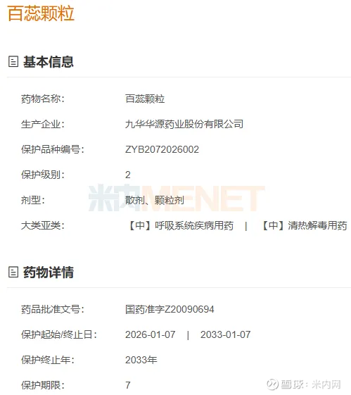 今年1月,国家药监局官网发布公告,九华华源药业的百蕊颗粒获批为首家中药二级保护品种。该产品是国家医保乙类、国家基药品种,有清热消炎、止咳化痰功效,用于急/慢性咽喉炎、气管炎、鼻炎、感冒发热、肺炎等,连续多年在中国三大终端六大市场位居清热解毒中成药TOP10品牌之列,2023年-2024年销售额均超过5亿元。据了解,九华华源药业是国家高新技术企业,拥有130余个药品批文,其中百蕊颗粒、玉叶金花清热片等独家品种覆盖儿科、呼吸科等领域。